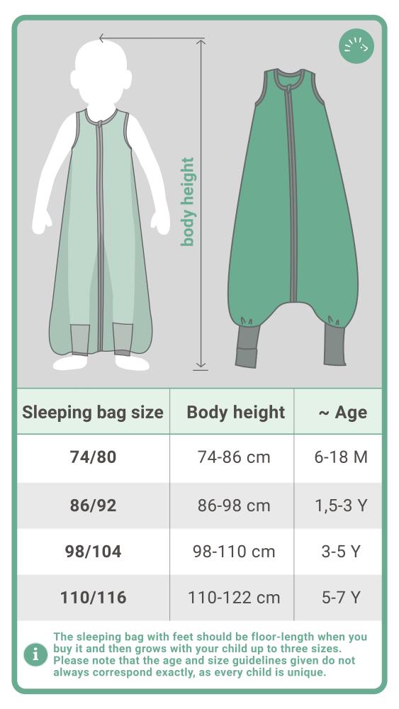 For safe baby sleep, we recommend a sleeping bag in the correct size: the child's body length from head to toe plus 10 cm. In this table, you'll find our size recommendations: